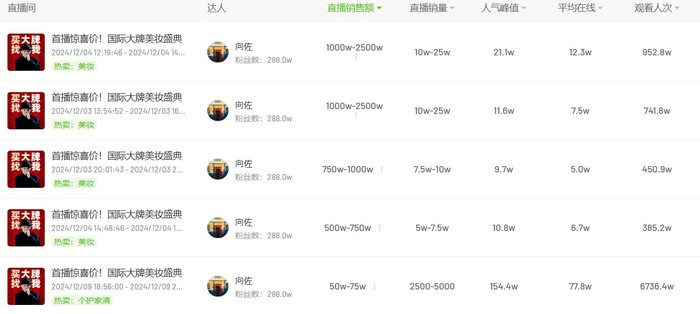 12月3日,向佐与海旅免税集团合作,在三亚海旅免税城现场带货大牌美妆日化产品。据青眼情报统计数据,向佐于12月3日至4日共进行了4场直播,连续两日登上抖音美妆带货榜第一,总计商品链接数量为82个。场均观看人次为632.7万,最高观看人次为952.8万,场均销量为10万至25万件,场均直播时长为2小时。
