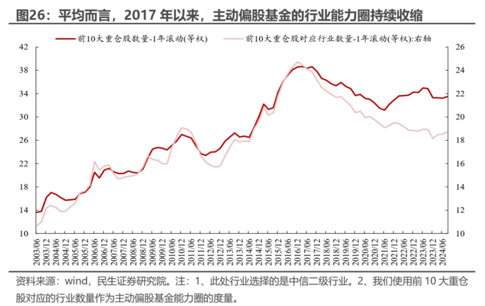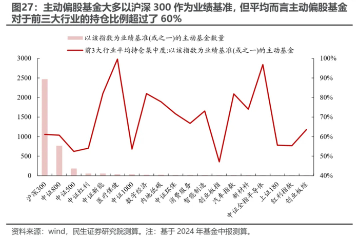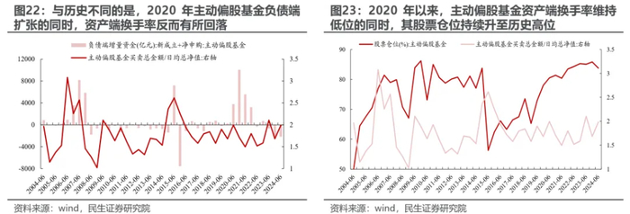 回看2019年至2021年主动偏股基金的发展,本轮主动基金实际上可能是在以类似于“ETF”的方式进行运作:相较于2007年与2015年以来,一方面,2019年至2021年,主动偏股基金在负债端扩张期始终维持了较低的换手率,同时将其股票仓位缓慢升至历史高位;另一方面,从具体持仓结构来看,2020年以来,在大多主动基金以沪深300作为业绩基准的同时,主动基金更多的选择以主题/赛道基金的形式集中持仓,同时,主动基金整体的持仓行业范围经历了一轮明显的收缩。