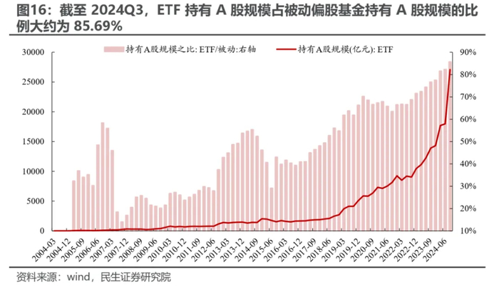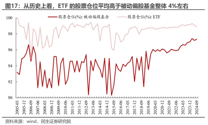 伴随被动崛起的是,国内ETF基金的兴起。正如我们在前文中讨论的,被动与ETF并非完全等同,而从我国被动基金的发展来看,2018Q1之前的大多数时间里,ETF并非是被动基金的主流,而自2018Q2以来,ETF在被动基金中的规模占比稳定在50%以上,截至2024Q3,ETF持有A股规模占被动基金的比重在85%以上。值得一提的是,对比ETF与被动基金的股票持仓来看,平均而言,ETF的股票仓位在历史上高于被动偏股基金整体4%左右,这意味着ETF相较于被动基金更容易实现较小的跟踪误差,同时,实物申赎机制和做市商的存在也一定程度确保了ETF的流动性强于普通指数基金。