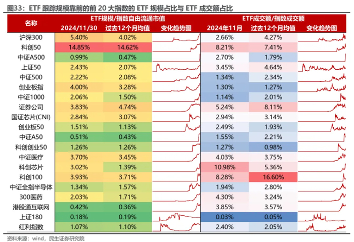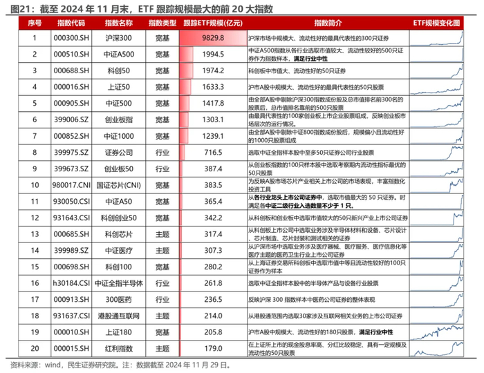 截至2024年11月末,ETF跟踪规模最大的20大指数以市值分层指数(沪深300、上证50、中证500、中证1000等)、科创/创业板(科创50、创业板指等)以及部分行业(券商、芯片、医药等)为主要构成,其中,沪深300ETF的规模远远超过其他指数。值得关注的是,行业中性指数(中证A500、中证A50、上证180)自2024年9月下旬以来开始成为ETF的主要增量领域。