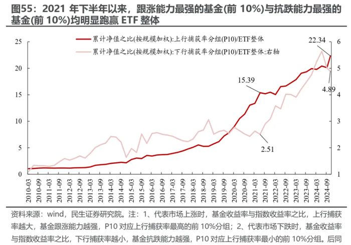 这实际上指示的是在ETF崛起之时,主动跑赢被动的两类方法:一是高仓位+高集中持仓抓住上涨;二是应对风险时主动降低仓位+相对分散持仓。值得一提的是,从历史上看,前者往往是表现更好的方法,而后者表现平平,但自ETF逐步崛起,后者反而更加占优。考虑到高仓位集中持仓且选对方向的难度可能高于在面对风险时主动降低仓位,特别是如果行业轮动速度较快时,这意味着在ETF兴起之时,对于主动基金而言,仓位择时的重要性在提升。