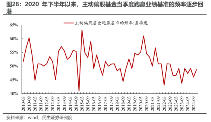 在主动基金逐步“ETF”化的同时,自2020年下半年以来,主动偏股基金当季度能够跑赢业绩基准的频率开始从高位回落,但依然能够在大多数时间跑赢基准。而自2021年下半年以来,一方面,主动偏股基金在大多数时间业绩开始难以跑赢业绩基准;另一方面,主动偏股基金业绩明显跑输ETF。主动基金相较于股票ETF基金业绩的走弱是被动崛起背后的重要因素。