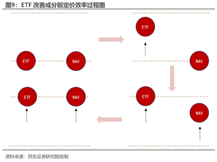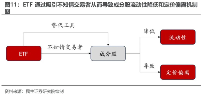 与此同时,由于大量不知情交易者从个股转向ETF二级市场,可能会导致短期基本面发生变化时,ETF二级市场有更多的参与者实现快速定价。这种定价会通过套利与做市商等机制传导到底层的个股,使得底层个股也开始反映市场整体基本面的变化而非公司自身基本面的变化,从而使得底层个股出现一定的定价偏离(Chen et al., 2024)[14]。