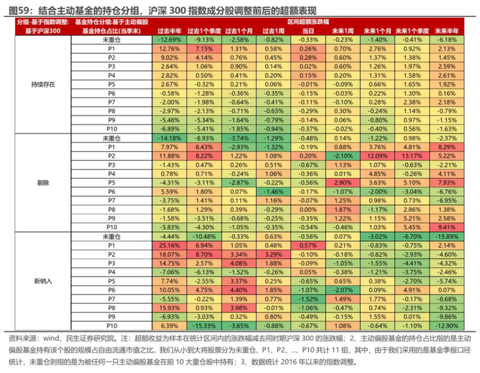 1)新纳入指数成分股往往在纳入指数之前表现较好,其中,新纳入指数且主动偏股基金持股比例较高的标的,在未来6个月往往会明显跑输指数本身;