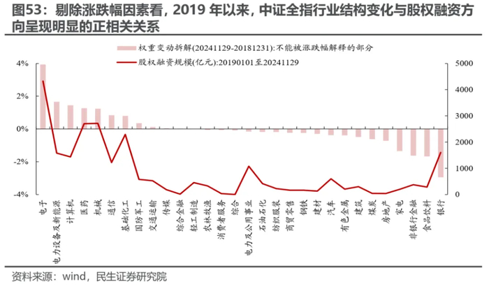 ETF崛起对于市场的重要影响之一是能够在一定程度上实现投资与融资端的再平衡。以中证A500为例,其编制规则要求其各一级行业的自由流通市值分布与其样本空间(中证全指)尽可能一致,而拆解2019年以来中证全指的行业结构变化来看:剔除涨跌幅因素看,除银行外,2019年以来,中证全指行业结构变化与股权融资方向呈现明显的正相关关系,即股权融资规模较高的行业大多也是行业权重提升较多的行业。从这一点看,以中证A500为代表的指数的编制方法能一定程度上引导ETF资金适应性配置市场股权融资较多的行业。