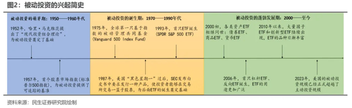 2、被动投资的诞生期:1970——1990年代。1971年,富国银行为管理新秀丽的养老金,发行了一只基金来追踪纽交所的1500只股票的整体走势。但因其追踪的股票太多,股票波动较大,基金调整持仓的频率较高、交易成本过高,不久就以失败告终。1975年,先锋集团推出了Vanguard 500 Index Fund,旨在跟踪标准普尔500指数的表现,这是全球第一只基于指数的被动管理共同基金。1987年,美国“黑色星期一”过后,美国证券交易委员会 (SEC) 发布了一份白皮书,白皮书中要求发行一种产品,使投资者能够在交易所交易一揽子股票,这为后面ETF的诞生奠定基础。1992年,先锋集团推出了Vanguard Total Stock Market Index Fund,为投资者提供了更广泛的市场覆盖,不再仅限于标准普尔500指数,进一步推动了被动投资的理念。1993年,道富推出SPDR S&P 500 ETF(SPY)标志着全球首只ETF诞生。ETF的推出大大降低了投资者的交易成本,并且使被动投资更加灵活。