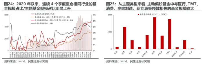 值得关注的是,基于2024年11月末中证全指的行业权重以及2024Q3主动偏股基金的持仓分布来看:主动偏股基金相较于中证全指配置了更多的电子、电新、食品饮料、医药等行业,低配了较多的非银、计算机、银行、电力及公用事业等板块。考虑到主动和ETF规模的此消彼长,这一变化对股价影响不大,原因在于主动偏股基金在配置上可能相对更加抢跑了电子、电新、医药等市场权重较高资产。