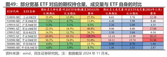 此外,值得关注的是,部分宽基ETF存在对应的ETF期权,且部分ETF期权的名义成交量/名义持仓规模与对应ETF的规模之比较高。这意味着上述ETF的参与者构成与潜在的投资策略可能更为多元,这在一定程度上也丰富了ETF的功能。