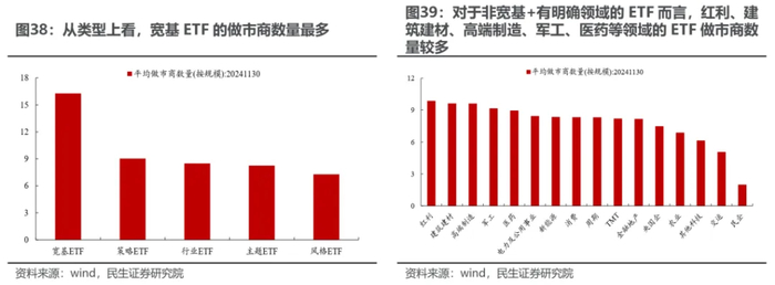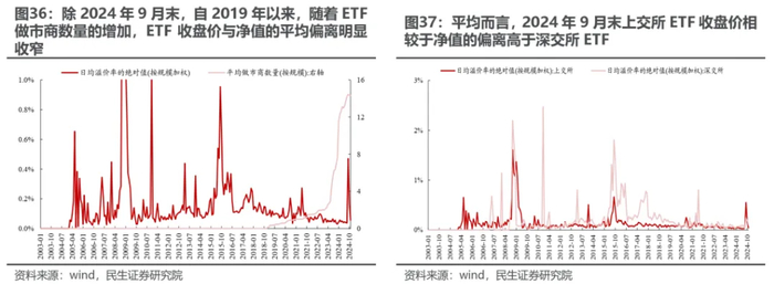 从一二级联动视角来看,ETF的净申购与ETF交易活跃度之间存在明显的正相关关系:即ETF交易活跃度的提升往往会伴随着ETF的净申购。其背后不可忽视的角色是ETF做市商,特别是考虑到实物申购对于一般投资者而言可能存在较高的成本。正如我们在前文讨论的,ETF做市商的存在为ETF本身提供了明显的流动性并且减少一二级定价的偏离,从A股的实际情况来看也确实如此:从历史上看,在A股大幅下跌时往往会出现ETF二级交易相较于净值的折价,但随着2019年以来ETF做市商数量的明显增加,ETF收盘价与净值之间的平均偏离明显收窄(除2024年9月末上交所宕机外)。此外,从具体类型来看:宽基ETF的做市商数量最多,而对于非宽基+有明确领域的ETF而言,红利、建筑建材、高端制造、军工、医药等领域的ETF做市商数量较多。