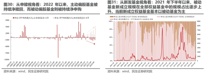 与之对应的是,从权益基金负债端的趋势来看,伴随着ETF逐步表现占优,被动基金对于主动基金的替代自2021年下半年以来就初现端倪:一方面,从新发基金的构成来看,2021年下半年以来,被动基金新成立规模在全部权益基金中的规模占比逐步上升,而当前新成立权益基金基本以被动基金为主;另一方面,从申赎视角看,2022年以来,主动偏股基金被持续净赎回,而被动偏股基金则被持续净申购。政策鼓励下,主动基金与ETF之间在负债端的“此消彼长”是被动崛起的另一重要因素。