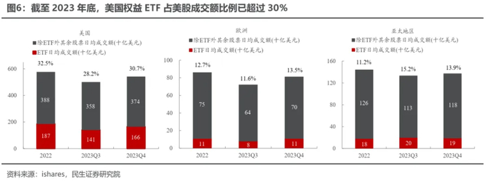截至2023年底,全球ETF规模已达11.61万亿美元。从ETF数量占比来看,截至2024年6月末,全球ETF数量占基金数量比例已达6.6%。从主要地区来看,美洲的ETF数量占比远超全球平均水平,增速趋于稳定;而亚太地区ETF数量增速继续上升,欧洲地区则增速较慢,明显低于全球平均水平。从ETF活跃度来看,截至2023年底,美国权益ETF占美股成交额比例已超过30%;欧洲和亚太地区该占比均为13%左右,相比于2022年继续上升,但相比于美国还有较大提升空间。这意味着无论是从规模、数量和活跃度的视角来看,ETF已逐步成为影响全球市场定价的重要力量之一,并且在亚太地区的发展更为迅猛。