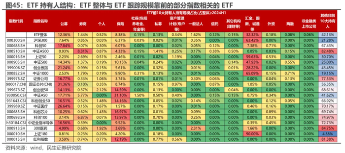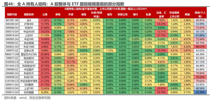 2)对于A股而言,整体来看,公募、证金/汇金、外资、两融以及保险等是A股的主要参与者。对于ETF跟踪规模靠前的部分指数而言,证金/汇金在红利指数、沪深300、中证A500、上证50、券商、上证180等指数成分股上的持有占比较高,而公募在大多指数上的占比均较高,外资次之,险资持有比例较高的领域则主要集中在沪深300、上证50、上证180、中证A50以及红利指数等领域。