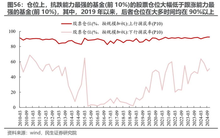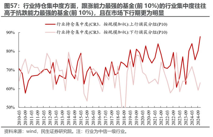 1)跟涨能力最强的基金(前10%)的股票仓位自2019年以来持续处于90%以上,且行业集中度明显更高;