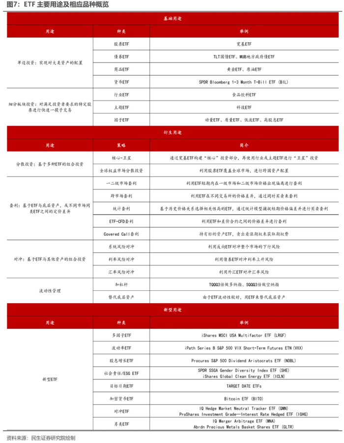 随着全球ETF种类的日渐丰富,ETF的用途也变得更加广泛。整体而言,ETF为投资者表达市场观点提供了一种规则化工具。我们根据ETF的用途分为三大类:基础用途、衍生用途和新型用途: