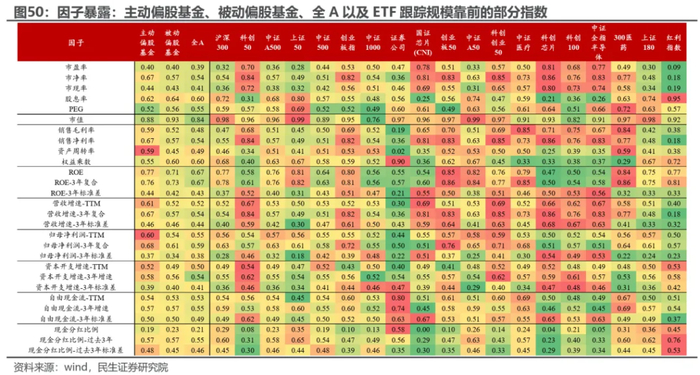 此外,结合我们在前面的讨论:一方面,当市场上行时,ETF相较于主动基金而言可能具有更高的业绩弹性,仓位更高且能够突破单一股票10%的仓位上限(指数有单独规定的除外);另一方面,ETF的存在也为更加多元的参与者提供了便利:无论是专业投资者、不知情交易者(对上市公司)、汇金、还是衍生品交易者均能够找到使用该工具的理由。在ETF做市商与一二级套利者的参与下,上述变化也将反映到A股市场的定价上,当ETF工具遇上更多元的参与者使用,我们认为,市场的定价维度也将发生转变:从过去传统意义上的自下而上个股研究,逐步转向一揽子研究(因子)。对于主动基金而言,应对ETF挑战的另一应对方法是逐步建立组合投资思维。