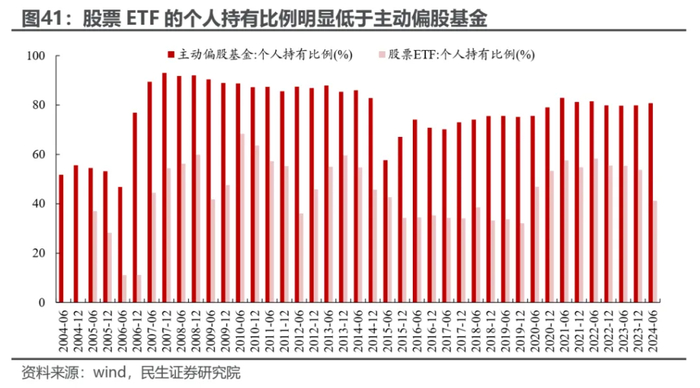持有人结构方面,穿透ETF联接来看,ETF整体以机构投资者持有为主,截至2024H1,ETF整体的个人持有比例约为41.32%,明显低于主动偏股基金的80.76%。但结构上不同ETF差异较大: