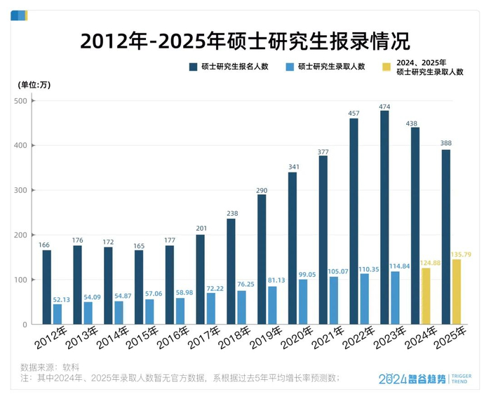 硕士博士大扩招,根据这几年的平均增速估算,2025年招生人数可能达到135万左右;