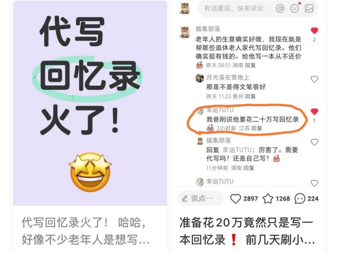 比如,一些年轻人就开发出了给老年人“代写回忆录”的新蓝海,“只工作不上班,我给老年人写回忆录月入两万”,“写了三本回忆录,收入够买一辆车”。