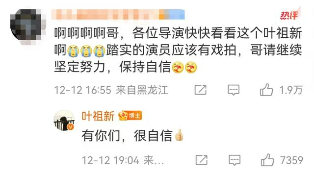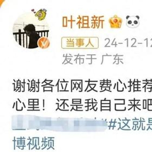 12月12日,男演员叶祖新在个人社交平台回应网友帮他求职一事:谢谢各位网友费心推荐各种适合角色!收到了,在心里!还是我自己来吧。