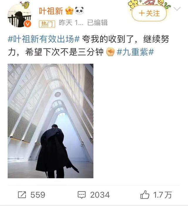 12月7日晚,叶祖新曾发文回应这几分钟的有效出场。“夸我的收到了,继续努力,希望下次不是三分钟。”