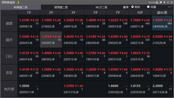 30年国债活跃券2400006下行4.26bp突破2%,截至发稿报1.9999%。