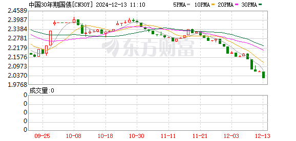 12月12日,30年期国债活跃券“24特别国债06”首笔成交收益率持平报2.055%,收盘报2.0425%。继10年期国债收益率在上周跌破2%之后(12日收报1.815%),30年期国债似乎也“破2”在即。