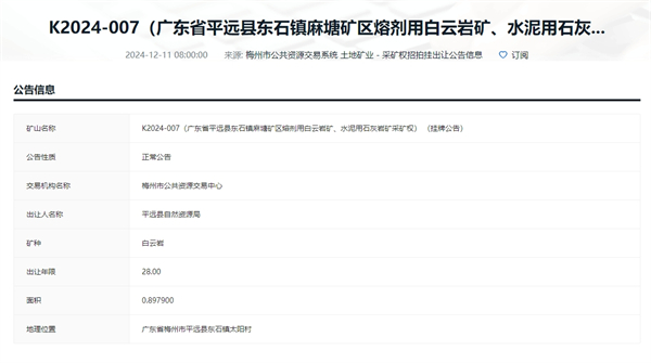 据出让公告显示,广东省平远县东石镇麻塘矿区熔剂用白云岩矿、水泥用石灰岩矿采矿权矿区面积0.8979平方公里。本期出让储量熔剂用白云岩9367.1万吨、粉料用大理岩3420.98万吨、水泥用石灰岩3994.66万吨、铁矿9.83万吨。