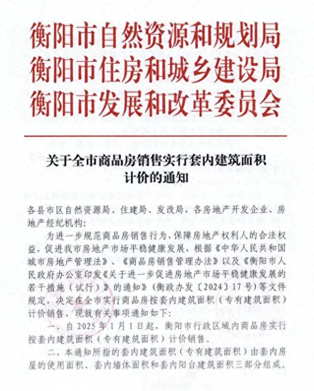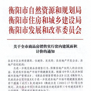 据了解,衡阳市自然资源和规划局、衡阳市住房和城乡建设局、衡阳市发展和改革委员会近日联合发布了《关于全市商品房销售实行套内建筑面积计价的通知》。