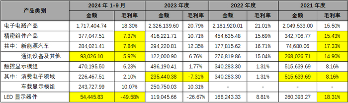 触控显示模组产品方面,其明细 消费电子 领域业务毛利率于报告期内也同样出现大幅下滑,2022年-2023年,该细分产品营收同比持续大幅下滑分别达34.01%和30.81%,导致公司消费电子领域触控显示模组产品对应各期毛利率分别仅为1.31%、-7.31%,2023年该业务已一度处于亏损经营。至2024年前三季度,发行人该细分产品毛利率虽有所提升至2.1%,但仍然远远不及2021年8.16%的毛利率水平。