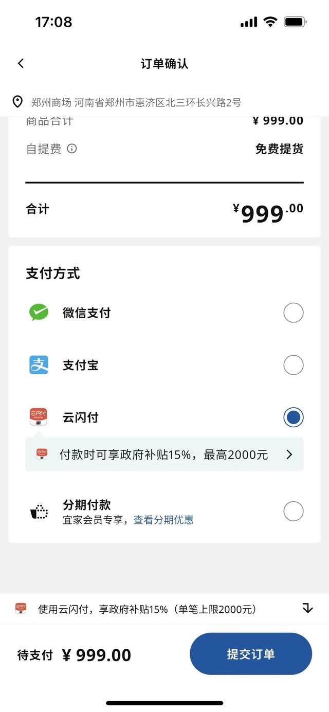 可选择“云闪付”支付后