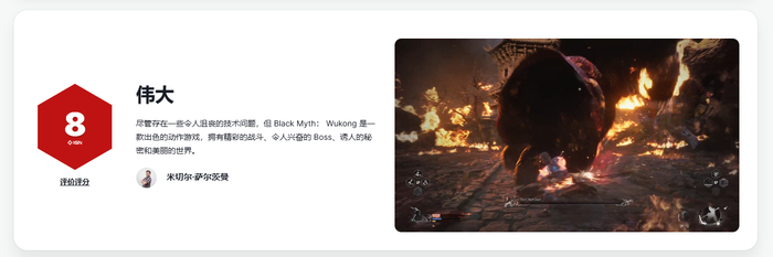 全球主流评论网站IGN给予了《黑神话》极高的评价。