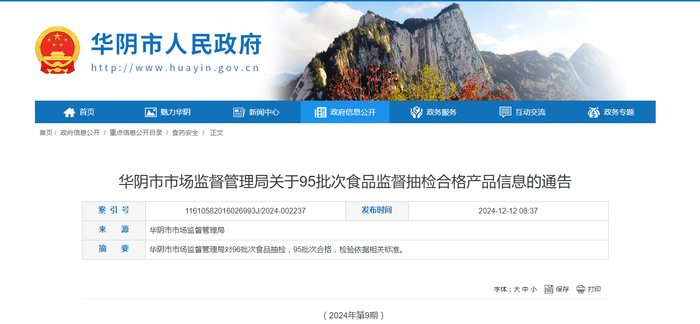 陕西省华阴市市场监督管理局关于95批次食品监督抽检合格产品信息的通告(2024年第9期)