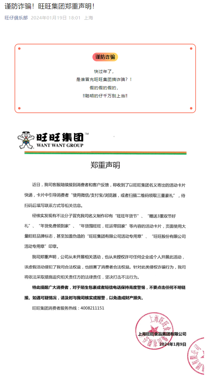 值得注意的是,旺旺集团于今年1月也在其微信公众号发布郑重声明称,“有不法分子冒充我司名义制作印有‘旺旺年货节’‘赠送3重双节好礼’‘年货免费领到家’‘年货囤旺旺,旺运带回家’等内容的活动卡片,页面使用大量旺旺品牌标志,甚至加盖伪造的‘旺旺集团有限公司活动专用章’‘旺旺股份有限公司活动专用章’印章。”