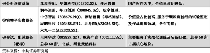从功能用途及业务领域上划分,军事仿真产品主要由体系架构设计系统、战场空间信息及可视化分析系统、数字仿真引擎(严肃训练游戏)、分析评估系统、实物半实物设备和参试、配试装备等部分组成,其中数字仿真引擎和实物半实物设备的价值量占比较高。各个业务领域差由于用途迥异,估值及增速差异性较大,故各板块业务公司需拆分来研究。