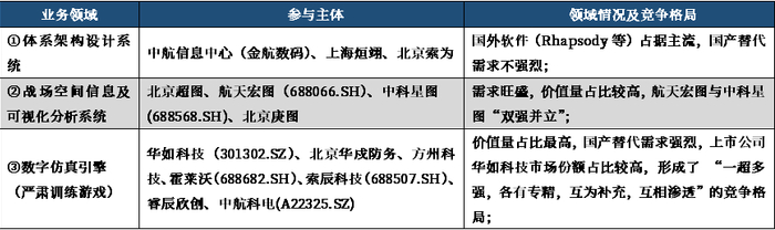 由于军事仿真行业贯穿军工产业链全流程,为了满足各类应用场景需求的各类产品功能差异化较大,使得行业内企业各有专精,互为补充。