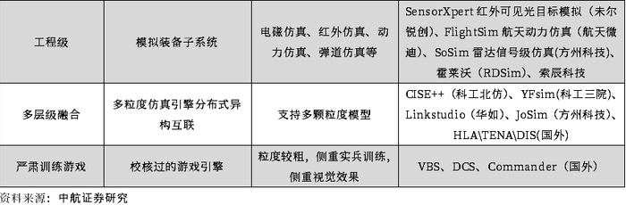 数字仿真引擎,军事仿真的核心。数字仿真引擎是针对客户需求,以军事理论要素为基础所开发的虚拟现实和数据应用系统。该类系统通过构设虚拟战场空间,模拟对抗双方兵力和作战行为,在近似真实的数字环境中,研究战争、预知战争、培训作战人员与装备,侧重于定量分析。客户定制化程度较高、产品软件占比较高是数字仿真引擎的突出特点。数字仿真引擎按颗粒度及侧重可以划分为战役级、任务级、交战级、工程级、多层级虚实融合平台及严肃训练游戏。