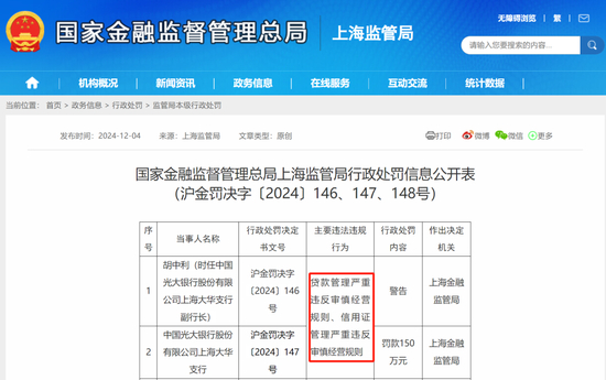 12月4日,国家金融监管总局上海监管局行政处罚信息显示,光大银行上海大华支行,因贷款管理严重违反审慎经营规则、信用证管理严重违反审慎经营规则,被罚款150万元。时任光大银行上海大华支行副行长,也被处以警告。