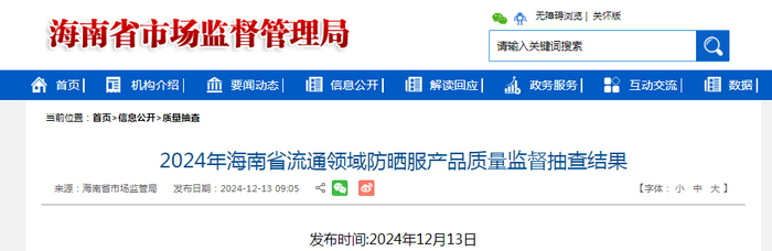 2024年海南省流通领域防晒服产品质量监督抽查结果公布