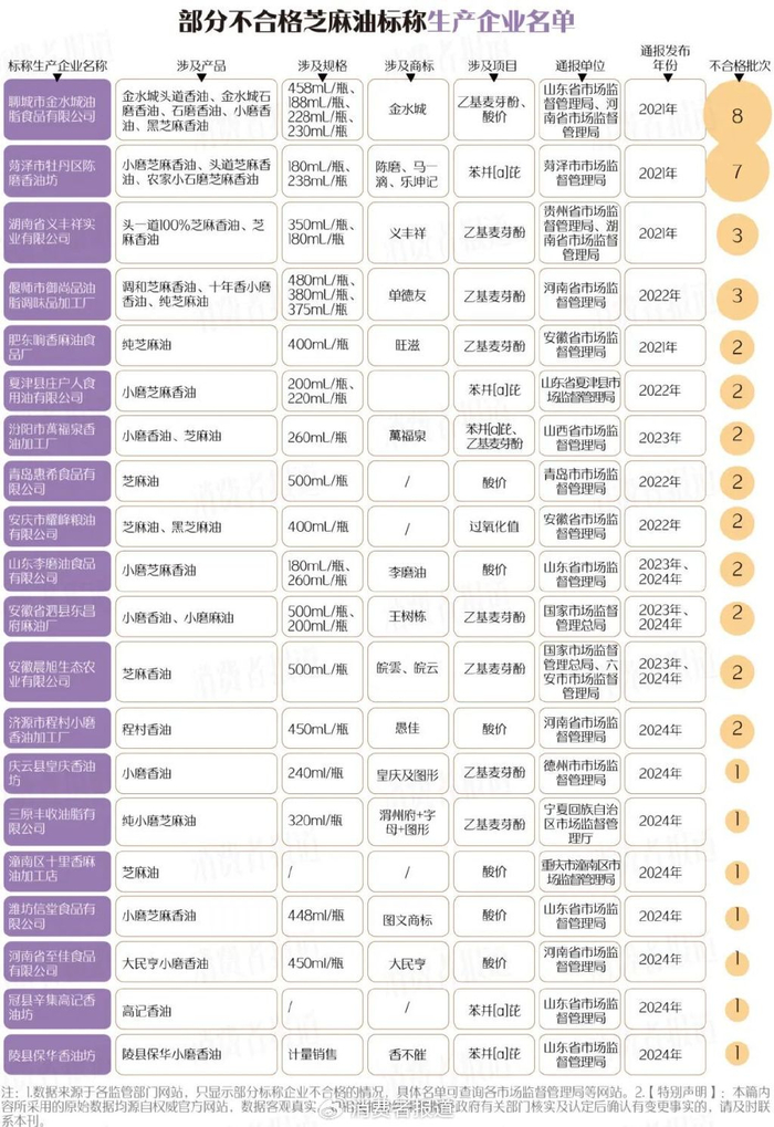 2024年12月,《消费者报道》整理了国家市场监督管理总局以及省、市级市场监督管理局于2021年至今近3年关于芝麻油的质量抽检数据。