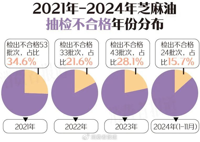 从2021年至2024年11月,各地监管部门抽检发现不合格芝麻油153批次。从抽检年份看,不合格芝麻油主要集中在2021年、2023年,分别抽检出不合格53批次、43批次,合计占比62.7%。