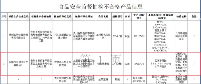 抽检结果显示,根据贵州省市场监督管理局关于23批次食品抽检不合格情况的通告(2022年第5期),标称安顺市平坝区可立调味品厂生产的精品香麻油(3.8L/桶,2021/4/3)被检出乙基麦芽酚为14100μg/kg,是近些年乙基麦芽酚检出值最高的一批次。