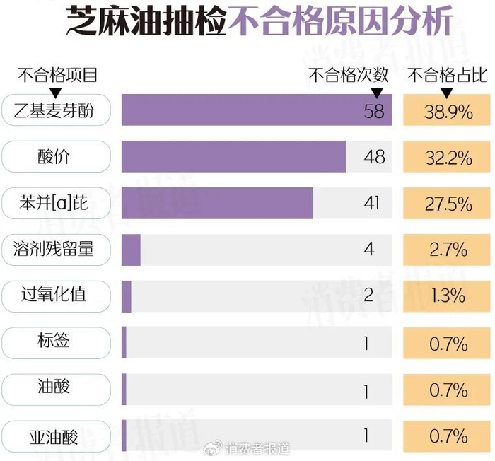 结果显示,各地监管部门抽检发现不合格芝麻油153批次,不合格项目主要集中在乙基麦芽酚、酸价、苯并[a]芘。