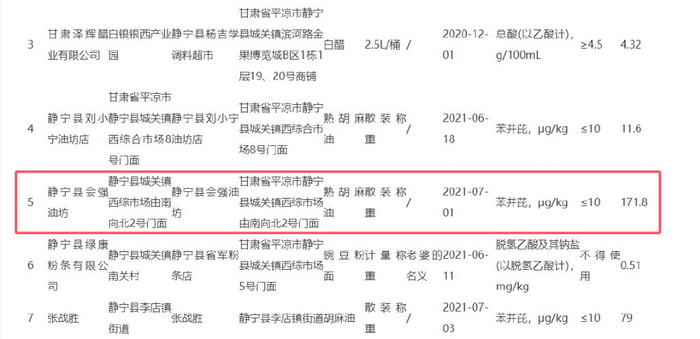 抽检结果显示,近3年有41批次芝麻油因苯并[a]芘超标被通报。其中,根据平凉市市场监督管理局关于11批次食品抽检不合格情况的通告(2021年第8期),标称静宁县会强油坊生产的熟胡麻油(散装称重,2021/7/1)苯并[a]芘的检出值为171.8μg/kg,超标17倍多。
