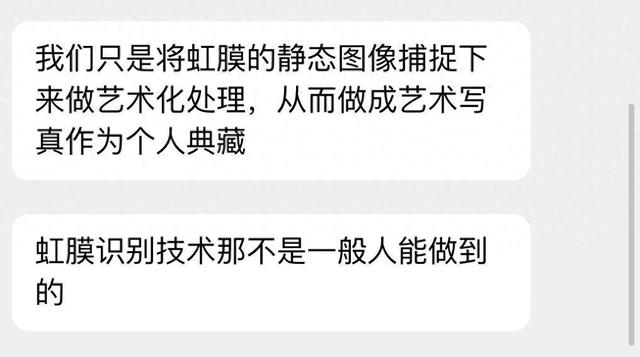 记者以顾客身份联系到南京一家从事虹膜写真摄影的商铺,工作人员介绍,“只拍摄眼睛,拍摄时会有闪光灯和辅助灯,这样为了更清楚地拍出虹膜纹理。最后等15分钟即可现场拿片,可以观察到自己的虹膜纹长什么样子。”沟通过程中,记者表示了对虹膜写真隐私安全的担忧,工作人员称,“拍摄使用的是微单相机拍虹膜,不会泄漏隐私。”