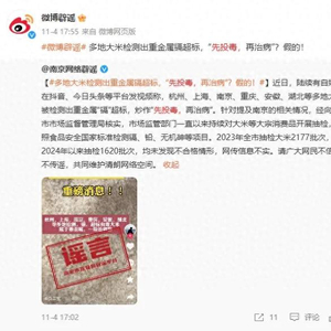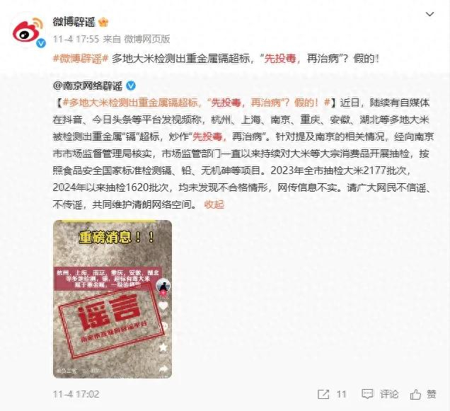 “南京网络辟谣”就已经在新浪微博平台上针对“‘镉’毒大米”发布了辟谣信息,表示网传信息不实。随后“微博辟谣”官方账号转发该条博文。