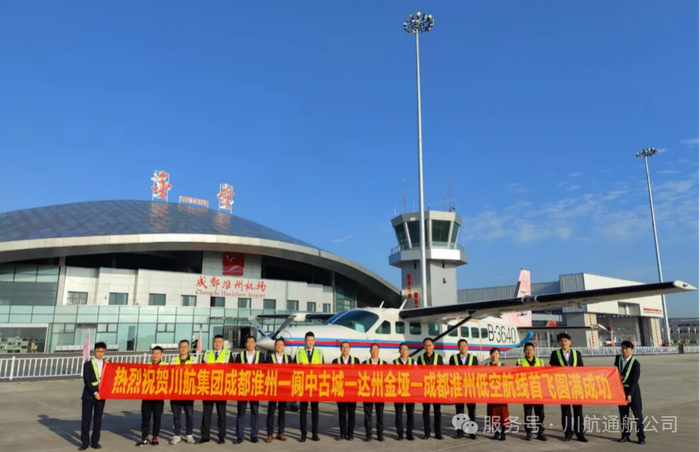 10月23日,川航集团下属四川通航投资管理有限公司在淮州机场进行成都淮州-阆中古城-达州金垭-成都淮州三地民用机场间的短途运输航线首飞,并在此基础上推动开通常态化运行低空航线各项工作。