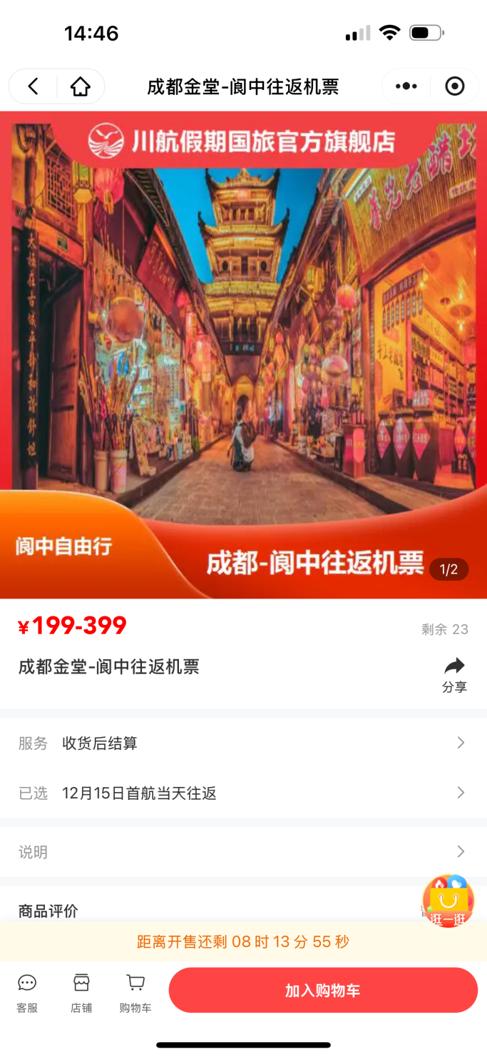 票价方面:从川航官方购票小程序“川航假期”查询显示,目前最低票价为199元(当天往返)。