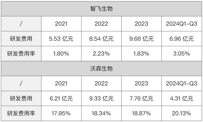 单看研发费用的话,智飞生物这两年一直在增加,但是研发费用率却一直较低。从营收规模来看,智飞生物是老朋友刘俊辉参与创办的沃森生物的10倍左右,但是两家公司的研发费用却相差不大。