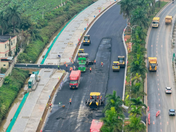 摊铺机缓慢、匀速地将沥青摊铺在路面上,压路机以紧跟、慢压、高频、低幅的节奏碾压路面……当下翠亨新区香海路北段道路工程正是一片热火朝天的施工景象。