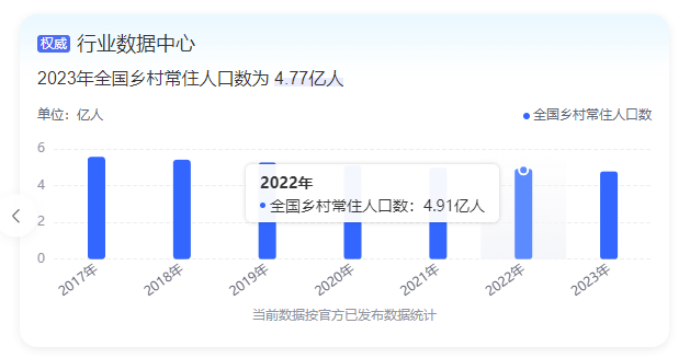 2022年,全国乡村常住人口为4.91亿人。而到了2023年,已降至4.77亿。
